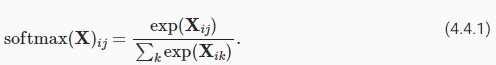 softmax를 계산하려면 세 단계가 필요합니다. (i) 각 항의 거듭제곱; (ii) 각 예에 대한 정규화 상수를 계산하기 위한 각 행에 대한 합계; (iii) 각 행을 정규화 상수로 나누어 결과 합계가 1이 되도록 합니다.