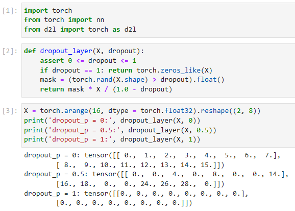 첫 번째 출력은 dropout_p가 0인 경우입니다. 즉, 드롭아웃 확률이 0이므로 모든 원소를 유지합니다. 따라서 출력은 입력 X와 동일한 텐서입니다.