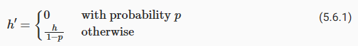 표준 드롭아웃 정규화에서는 각 레이어의 일부 노드를 0으로 만든 다음 유지된(드롭아웃이 아닌) 노드의 일부로 정규화하여 각 레이어의 편향성을 제거합니다. 즉, 드롭아웃 확률이 p인 경우 각 중간 활성화 ℎ는 다음과 같이 임의 변수 ℎ'로 대체됩니다.