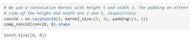 conv2d = nn.LazyConv2d(1, kernel_size=(5, 3), padding=(2, 1))