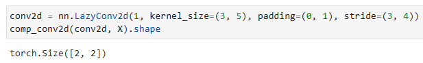 conv2d = nn.LazyConv2d(1, kernel_size=(3, 5), padding=(0, 1), stride=(3, 4))