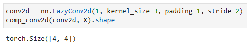 conv2d = nn.LazyConv2d(1, kernel_size=3, padding=1, stride=2)