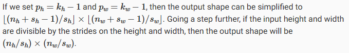 일반적으로 총 pℎ 행의 패딩(대략 절반은 위쪽, 절반은 아래쪽)과 총 pw 열의 패딩(대략 왼쪽 절반, 오른쪽 절반)을 추가하면 출력 모양은 다음과 같습니다.
