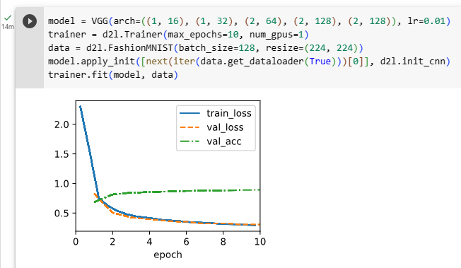 model = VGG(arch=((1, 16), (1, 32), (2, 64), (2, 128), (2, 128)), lr=0.01)은 VGG 모델을 생성합니다. arch 인자에는 VGG 블록 내의 합성곱 레이어 개수와 출력 채널 수를 지정한 튜플로 이루어진 리스트를 전달합니다. 또한, 학습률 lr도 지정합니다.