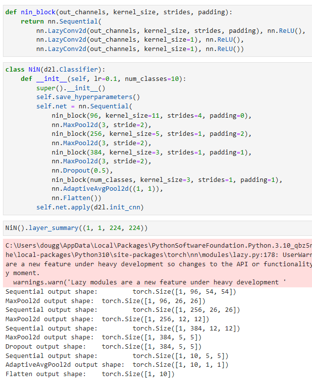 - nin_block 함수를 사용하여 NiN 블록을 생성하고 nn.Sequential에 추가합니다. 첫 번째 NiN 블록은 96개의 출력 채널을 가지며, 커널 크기는 11, 스트라이드는 4, 패딩은 0입니다.