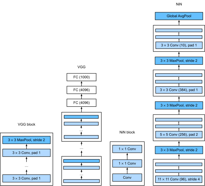 Fig. 8.3.1 illustrates the main structural differences between VGG and NiN, and their blocks. Note both the difference in the NiN blocks (the initial convolution is followed by 1×1 convolutions, whereas VGG retains 3×3 convolutions) and in the end where we no longer require a giant fully connected layer.