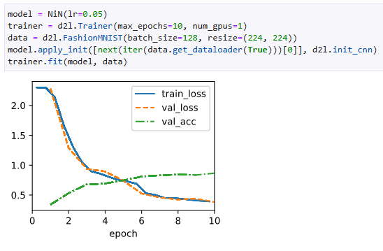 이전과 마찬가지로 Fashion-MNIST를 사용하여 AlexNet 및 VGG에 사용한 것과 동일한 옵티마이저를 사용하여 모델을 교육합니다.