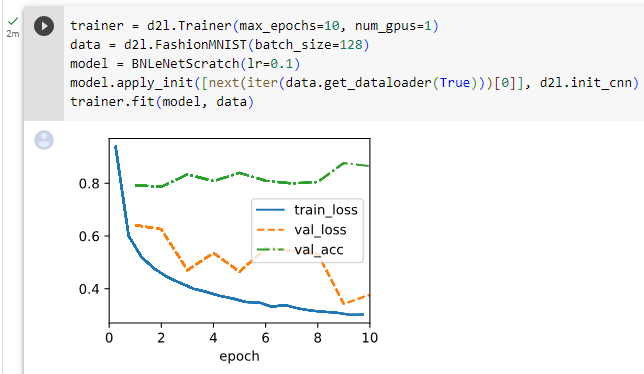 - model.apply_init([next(iter(data.get_dataloader(True)))[0]], d2l.init_cnn)를 호출하여 모델의 파라미터를 초기화합니다. 이 함수는 BNLeNetScratch 클래스의 인스턴스 model과 데이터 로더의 첫 번째 미니배치를 사용하여, 미리 정의된 d2l.init_cnn 함수를 이용해 모델의 파라미터를 초기화합니다.