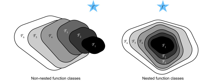 We know that regularization (Morozov, 1984, Tikhonov and Arsenin, 1977) may control complexity of F and achieve consistency, so a larger size of training data generally leads to better fF∗. It is only reasonable to assume that if we design a different and more powerful architecture F′ we should arrive at a better outcome. In other words, we would expect that fF′∗ is “better” than fF∗. However, if F⊈F′ there is no guarantee that this should even happen. In fact, fF′∗ might well be worse. As illustrated by Fig. 8.6.1, for non-nested function classes, a larger function class does not always move closer to the “truth” function f∗. For instance, on the left of Fig. 8.6.1, though F3 is closer to f∗ than F1, F6 moves away and there is no guarantee that further increasing the complexity can reduce the distance from f∗. With nested function classes where F1⊆…⊆F6 on the right of Fig. 8.6.1, we can avoid the aforementioned issue from the non-nested function classes.