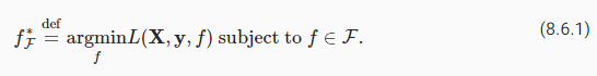Consider F, the class of functions that a specific network architecture (together with learning rates and other hyperparameter settings) can reach. That is, for all f∈F there exists some set of parameters (e.g., weights and biases) that can be obtained through training on a suitable dataset. Let’s assume that f∗ is the “truth” function that we really would like to find. If it is in F, we are in good shape but typically we will not be quite so lucky. Instead, we will try to find somefF∗ which is our best bet within F. For instance, given a dataset with features X and labels y, we might try finding it by solving the following optimization problem: