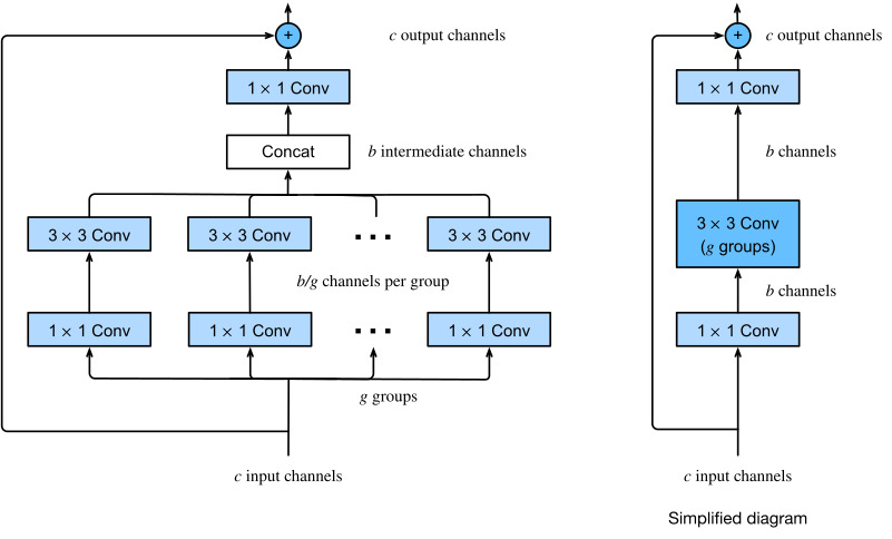 Breaking up a convolution from ci to co channels into one of g groups of size ci/g generating g outputs of size co/g is called, quite fittingly, a grouped convolution. The computational cost (proportionally) is reduced from O(ci⋅co) to O(g⋅(ci/g)⋅(co/g))=O(ci⋅co/g), i.e., it is g times faster. Even better, the number of parameters needed to generate the output is also reduced from a ci×co matrix to g smaller matrices of size (ci/g)×(co/g), again a g times reduction. In what follows we assume that both ci and co are divisible by g.