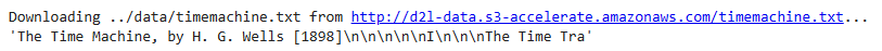 여기에서 우리는 H. G. Wells의 30000 단어가 조금 넘는 책인 The Time Machine과 함께 작업할 것입니다. 실제 애플리케이션에는 일반적으로 훨씬 더 큰 데이터 세트가 포함되지만 전처리 파이프라인을 보여주기에는 충분합니다. 다음 _download 메서드는 원시 텍스트를 문자열로 읽습니다.