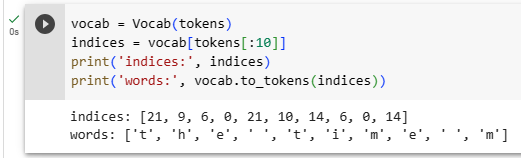 이러한 토큰은 여전히 문자열입니다. 그러나 모델에 대한 입력은 궁극적으로 숫자 입력으로 구성되어야 합니다. 다음으로 우리는 어휘를 구성하기 위한 클래스, 즉 각각의 고유한 토큰 값을 고유한 인덱스와 연결하는 개체를 소개합니다. 먼저 훈련 코퍼스에서 고유한 토큰 세트를 결정합니다. 그런 다음 각 고유 토큰에 숫자 인덱스를 할당합니다.