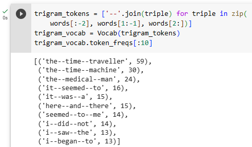 - trigram_vocab.token_freqs[:10]: trigram_vocab의 token_freqs 속성은 trigram과 해당 trigram의 빈도를 튜플 형태로 저장한 리스트입니다. 이 코드에서는 trigram_vocab에 포함된 trigram들 중 가장 빈도가 높은 상위 10개를 출력합니다.