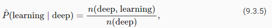 Here, we assume that the training dataset is a large text corpus, such as all Wikipedia entries, Project Gutenberg, and all text posted on the Web. The probability of words can be calculated from the relative word frequency of a given word in the training dataset. For example, the estimate P^(deep) can be calculated as the probability of any sentence starting with the word “deep”. A slightly less accurate approach would be to count all occurrences of the word “deep” and divide it by the total number of words in the corpus. This works fairly well, particularly for frequent words. Moving on, we could attempt to estimate where n(x) and n(x,x′) are the number of occurrences of singletons and consecutive word pairs, respectively.