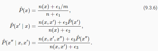Here ϵ1,ϵ2, and ϵ3 are hyperparameters. Take ϵ1 as an example: when ϵ1=0, no smoothing is applied; when ϵ1 approaches positive infinity, P^(x) approaches the uniform probability 1/m. The above is a rather primitive variant of what other techniques can accomplish (Wood et al., 2011).