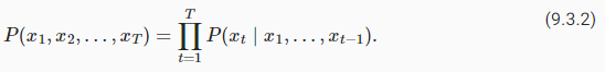섹션 9.2에서는 텍스트 시퀀스를 토큰으로 매핑하는 방법을 살펴봅니다. 여기서 이러한 토큰은 단어나 문자와 같은 개별 관찰 시퀀스로 볼 수 있습니다. 길이가 T인 텍스트 시퀀스의 토큰이 차례로 x1,x2,…,xT라고 가정합니다. 언어 모델의 목표는 전체 시퀀스의 결합 확률을 추정하는 것입니다.
