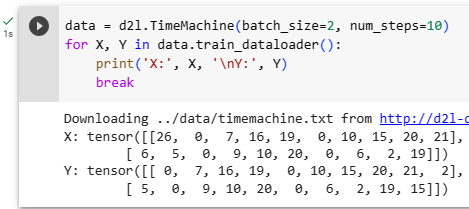 - data = d2l.TimeMachine(batch_size=2, num_steps=10): TimeMachine 클래스의 인스턴스를 생성하고, batch_size를 2로, num_steps를 10으로 설정하여 데이터 로더를 준비합니다.