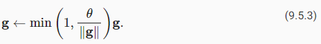 요약하면, 이 코드는 d2l.Trainer 클래스에 그레디언트 클리핑 기능을 추가한 clip_gradients 메서드를 정의한 예제입니다. 이 메서드는 주어진 모델의 파라미터들의 그레디언트를 계산하여 그레디언트의 노름이 지정된 임계값을 초과하는 경우 그레디언트를 임계값으로 스케일링하여 클리핑합니다.