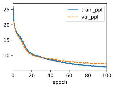 The following RNNLMScratch class defines an RNN-based language model, where we pass in our RNN via the rnn argument of the __init__ method. When training language models, the inputs and outputs are from the same vocabulary. Hence, they have the same dimension, which is equal to the vocabulary size. Note that we use perplexity to evaluate the model. As discussed in Section 9.3.2, this ensures that sequences of different length are comparable.