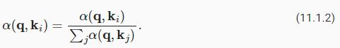 가중치 α(q,ki)는 convex combination, 즉 모든 i에 대해 ∑iα(q,ki)=1 이고 α(q,ki)≥0을 형성합니다. 이것은 딥 러닝에서 가장 일반적인 설정입니다. - Exactly one of the weights α(q,ki) is 1, while all others are 0. This is akin to a traditional database query.