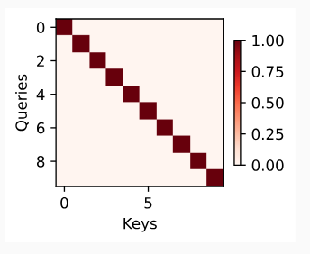 quick sanity check로 쿼리와 키가 동일한 경우에만 어텐션 가중치가 1인 경우를 나타내는 항등 행렬(identity matrix)을 시각화해 보겠습니다.