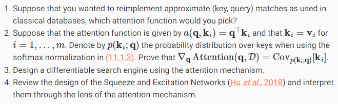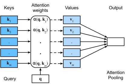 Clearly we would not have introduced a simple database here if it wasn’t for the purpose of explaining deep learning. Indeed, this leads to one of the most exciting concepts arguably introduced in deep learning in the past decade: the attention mechanism (Bahdanau et al., 2014). We will cover the specifics of its application to machine translation later. For now, simply consider the following: denote by Ddef={(k1,v1),…(km,vm)} a database of m tuples of keys and values. Moreover, denote by q a query. Then we can define the attention over D as where α(q,ki)∈ℝ (i=1,…,m) are scalar attention weights.