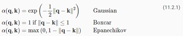 어텐션 메커니즘의 주요 구성 요소를 소개했으므로 이제 이를 다소 고전적인 설정, 즉 커널 밀도 추정(kernel density estimation)을 통한 회귀 및 분류(regression and classification)에서 사용하겠습니다(Nadaraya, 1964, Watson, 1964). 이 detour 는 단순히 추가 배경을 제공합니다. 완전히 선택 사항이며 필요한 경우 건너뛸 수 있습니다. 그들의 핵심에서 Nadaraya-Watson 추정기는 쿼리 q와 키 k를 관련시키는 몇 가지 유사성 커널 α(q,k)에 의존합니다. 일부 일반적인 커널은 다음과 같습니다.