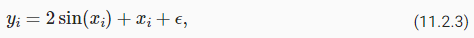 Nadaraya-Watson 추정이 실제로 작동하는지 확인하기 위해 몇 가지 학습 데이터를 정의해 보겠습니다. 다음에서는 ϵ가 평균이 0(zero mean)이고 unit variance이 있는 정규 분포(normal distribution)에서 도출되는 종속성(dependency )을 사용합니다.