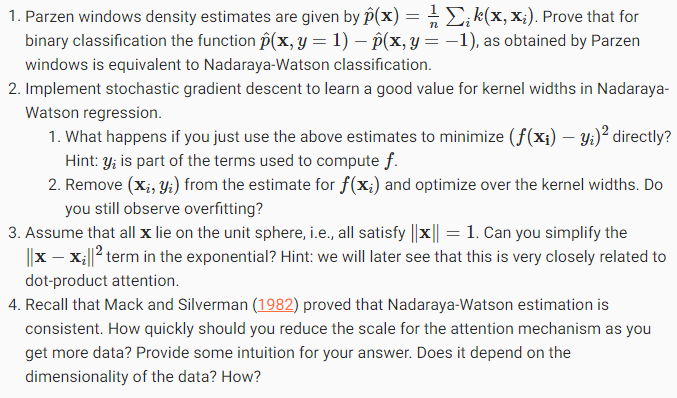Now that we introduced the primary components of the attention mechanism, let’s use them in a rather classical setting, namely regression and classification via kernel density estimation (Nadaraya, 1964, Watson, 1964). This detour simply provides additional background: it is entirely optional and can be skipped if needed. At their core, Nadaraya-Watson estimators rely on some similarity kernel α(q,k) relating queries q to keys k. Some common kernels are