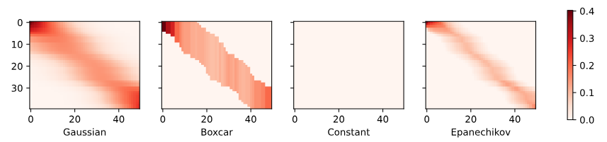 - 네 가지 서로 다른 커널 함수 gaussian, boxcar, constant, epanechikov를 정의합니다. 이러한 커널 함수는 주어진 입력 x에 따라 값을 계산하며, 각각 가우시안, 박스카, 상수, epanechnikov 커널을 나타냅니다.