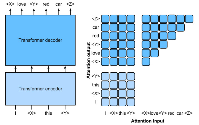 To obtain input and output from any original text, T5 is pretrained to predict consecutive spans. Specifically, tokens from text are randomly replaced by special tokens where each consecutive span is replaced by the same special token. Consider the example in Fig. 11.9.3, where the original text is “I”, “love”, “this”, “red”, “car”. Tokens “love”, “red”, “car” are randomly replaced by special tokens. Since “red” and “car” are a consecutive span, they are replaced by the same special token. As a result, the input sequence is “I”, “<X>”, “this”, “<Y>”, and the target sequence is “<X>”, “love”, “<Y>”, “red”, “car”, “<Z>”, where “<Z>” is another special token marking the end. As shown in Fig. 11.9.3, the decoder has a causal attention pattern to prevent itself from attending to future tokens during sequence prediction.