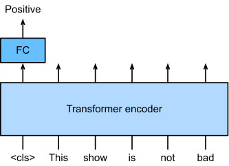 Fig. 11.9.2 illustrates fine-tuning of BERT for sentiment analysis. The Transformer encoder is a pretrained BERT, which takes a text sequence as input and feeds the “<cls>” representation (global representation of the input) into an additional fully connected layer to predict the sentiment. During fine-tuning, the cross-entropy loss between the prediction and the label on sentiment analysis data is minimized via gradient-based algorithms, where the additional layer is trained from scratch while pretrained parameters of BERT are updated. BERT does more than sentiment analysis. The general language representations learned by the 350-million-parameter BERT from 250 billion training tokens advanced the state of the art for natural language tasks such as single text classification, text pair classification or regression, text tagging, and question answering.