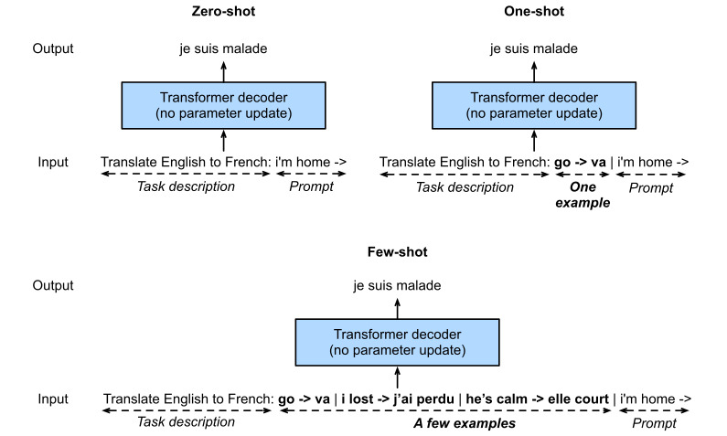 매개 변수 업데이트 없이 언어 모델을 보다 계산적으로 효율적으로 사용하는 방법을 설명하기 전에 일부 접두사 텍스트 시퀀스에 조건부 텍스트 시퀀스를 생성하도록 언어 모델을 훈련할 수 있다는 섹션 9.5를 상기하십시오. 따라서 미리 훈련된 언어 모델은 작업 설명, 작업별 입력-출력 예제 및 프롬프트(작업 입력)가 있는 입력 시퀀스에 따라 매개 변수 업데이트 없이 시퀀스로 작업 출력을 생성할 수 있습니다. 이러한 학습 패러다임을 in-context learning(Brown et al., 2020)이라고 하며, 더 나아가 제로샷(zero-shot), 원샷(one-shot), 퓨어샷(female-shot)으로 분류할 수 있다. 각각 입력-출력 예(그림 11.9.7).