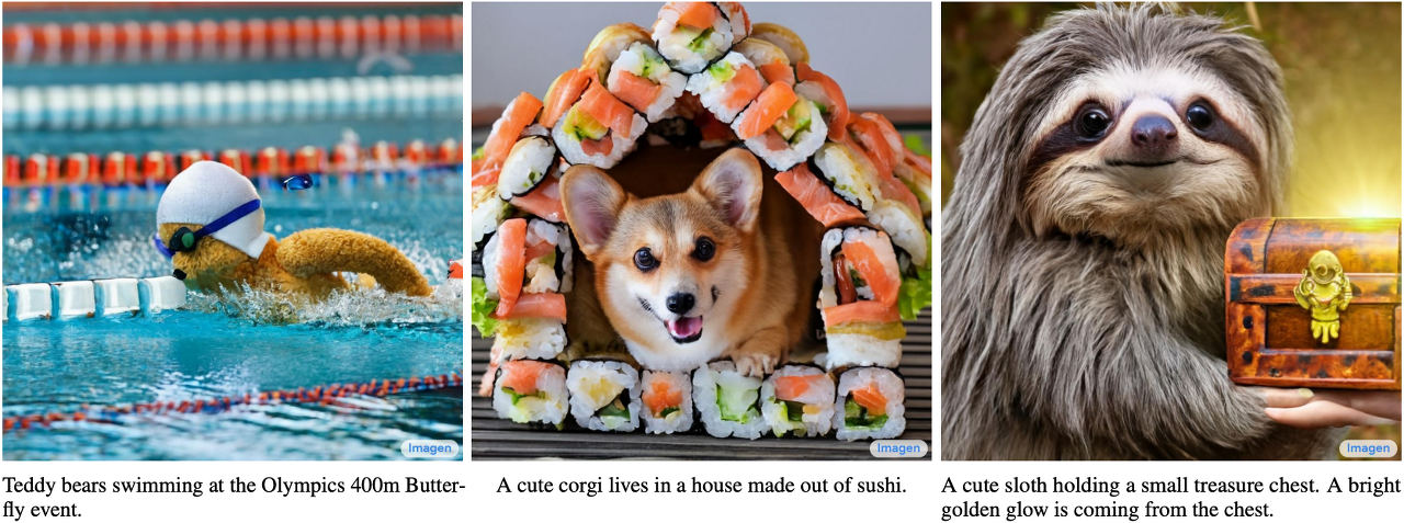 미세 조정 후 110억 매개변수 T5(T5-11B)는 다중 인코딩(예: 분류) 및 생성(예: 요약) 벤치마크에서 최첨단 결과를 달성했습니다. 출시 이후 T5는 이후 연구에서 광범위하게 사용되었습니다. 예를 들어 스위치 트랜스포머는 더 나은 계산 효율성을 위해 매개변수의 하위 집합을 활성화하기 위해 T5를 기반으로 설계되었습니다(Fedus et al., 2022). Imagen이라는 텍스트-이미지 모델에서 텍스트는 46억 개의 매개변수가 있는 고정된 T5 인코더(T5-XXL)에 입력됩니다(Saharia et al., 2022). 그림 11.9.5의 사실적인 텍스트 대 이미지 예는 미세 조정 없이도 T5 인코더만으로도 텍스트를 효과적으로 표현할 수 있음을 시사합니다.