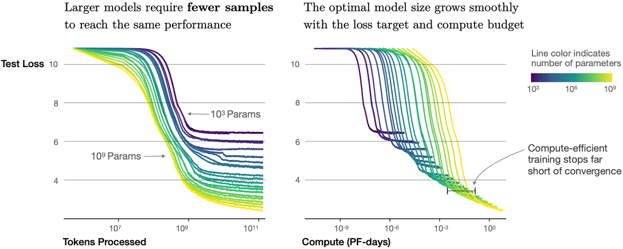 그림 11.9.9에서와 같이 Model size (number of parameters, excluding embedding layers), data size (number of training tokens) 그리고 amount of training compute (PetaFLOP/s-days, excluding embedding layers) 가 늘어날 수록 성능이 좋아진다. ==> power-law scaling을 볼 수 있다. 그러나 그것들을 동시에 증가시키는 방법은 여전히 논쟁의 문제로 남아 있습니다(Hoffmann et al., 2022).