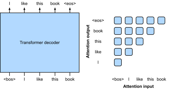 Following the autoregressive language model training as described in Section 9.3.3, Fig. 11.9.6 illustrates GPT pretraining with a Transformer encoder, where the target sequence is the input sequence shifted by one token. Note that the attention pattern in the Transformer decoder enforces that each token can only attend to its past tokens (future tokens cannot be attended to because they have not yet been chosen).