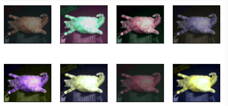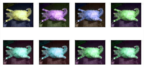 - apply(img, torchvision.transforms.ColorJitter(brightness=0.5, contrast=0, saturation=0, hue=0)): apply 함수를 호출하여 입력 이미지 img에 색상 조정 변환 함수를 적용합니다. 이를 통해 입력 이미지에 다양한 색상 조정 효과를 적용한 이미지들을 그리드 형태로 표시합니다.