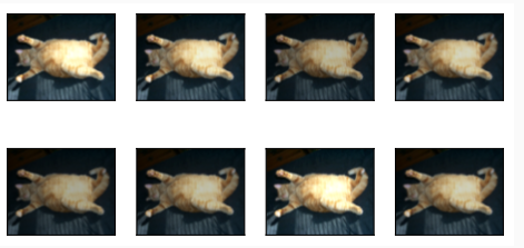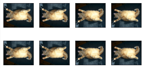 - apply(img, torchvision.transforms.RandomVerticalFlip()): apply 함수를 호출하여 입력 이미지 img에 torchvision.transforms.RandomVerticalFlip() 변환 함수를 적용합니다. 이 변환 함수는 입력 이미지를 무작위로 수직으로 뒤집습니다. 즉, 이미지의 위쪽과 아래쪽이 뒤바뀝니다.