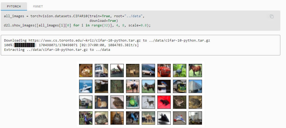 - train_ch13(net, train_iter, test_iter, loss, trainer, num_epochs, devices=d2l.try_all_gpus()): 다중 GPU로 모델을 학습하는 함수입니다. 인자로는 모델 net, 학습 데이터 로더 train_iter, 테스트 데이터 로더 test_iter, 손실 함수 loss, 옵티마이저 trainer, 학습 에포크 수 num_epochs, 그리고 사용할 GPU 디바이스들의 리스트 devices가 전달됩니다. 이 함수는 각 에포크마다 학습과 평가 과정을 반복하여 모델을 학습하고 성능을 평가합니다.