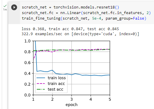 - train_fine_tuning(finetune_net, 5e-5): train_fine_tuning 함수를 호출하여 finetune_net 모델을 학습합니다. 5e-5는 학습률을 나타내며, 여기서는 상대적으로 작은 학습률로 설정되어 있습니다. 따라서 finetune_net 모델을 학습하면서 학습률을 조절하여 새로운 작업에 맞게 가중치를 조정하게 됩니다.