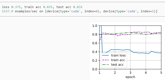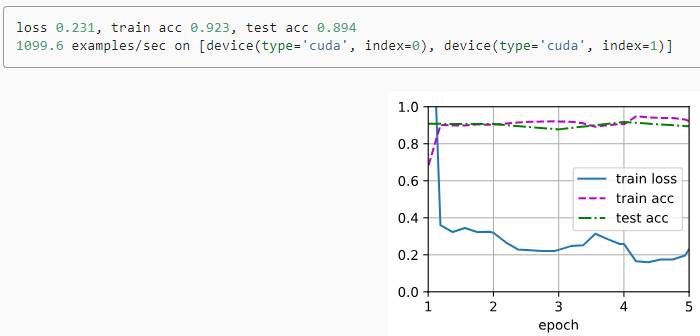 - d2l.train_ch13(...): 정의한 학습 함수를 호출하여 fine-tuning 학습을 수행합니다. 학습과 테스트 데이터셋, 손실 함수, 옵티마이저 등을 인자로 전달하여 모델을 학습시킵니다.