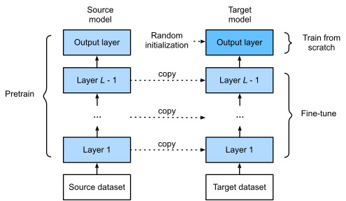 대상 모델은 출력 레이어를 제외한 소스 모델의 매개변수가 있는 모든 모델 디자인을 복사하고 대상 데이터 세트를 기반으로 이러한 매개변수를 미세 조정합니다. 반대로 대상 모델의 출력 계층은 처음부터 학습해야 합니다. - Generally, fine-tuning parameters uses a smaller learning rate, while training the output layer from scratch can use a larger learning rate.