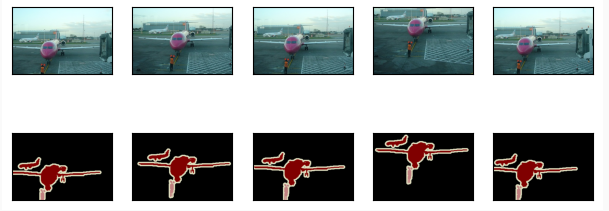 처음 5개의 입력 이미지와 레이블을 그립니다. 레이블 이미지에서 흰색과 검은색은 각각 테두리와 배경을 나타내고 나머지 색상은 다른 클래스에 해당합니다.