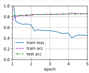 - d2l.train_ch13(net, train_iter, test_iter, loss, trainer, num_epochs, devices)는 모델을 학습시키는 함수를 호출합니다. 이 함수는 네트워크 모델, 학습용 데이터 반복자, 테스트용 데이터 반복자, 손실 함수, 옵티마이저, 에포크 수, GPU 장치 정보를 인자로 받아서 모델을 학습시키는 프로세스를 실행합니다.