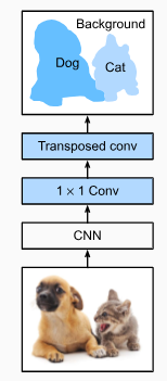 - The fully convolutional network first uses a CNN to extract image features, then transforms the number of channels into the number of classes via a 1×1 convolutional layer, and finally transforms the height and width of the feature maps to those of the input image via the transposed convolution.