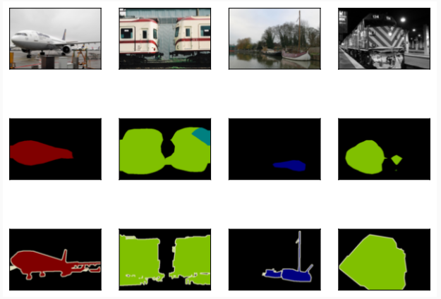 위 코드는 VOC 데이터셋의 테스트 이미지와 해당 이미지에 대한 예측 결과, 그리고 실제 레이블 이미지를 시각화하는 예제입니다.