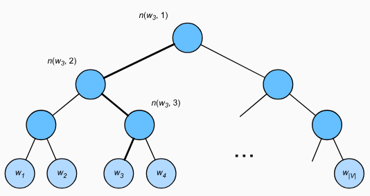 다행스럽게도 이진 트리 구조로 인해 L(wo)−1은 O(log2|V|) 정도이므로 사전 크기 V가 클 경우 계층적 소프트맥스를 사용한 각 학습 단계의 계산 비용은 이에 비해 크게 줄어듭니다. 대략적인 훈련 없이도 말이죠.