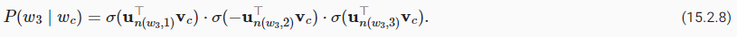 Denote by S the event that a context word wo comes from the context window of a center word wc. For this event involving wo, from a predefined distribution P(w) sample K noise words that are not from this context window. Denote by Nk the event that a noise word wk (k=1,...,K) does not come from the context window of wc. Assume that these events involving both the positive example and negative examples S,N1,...,Nk are mutually independent. Negative sampling rewrites the joint probability (involving only positive examples) in (15.2.3) as
