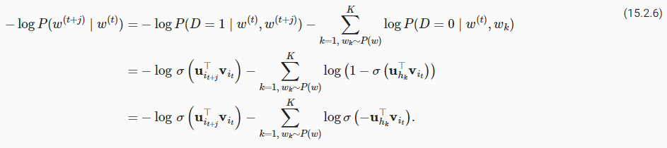 Denote by it and ℎk the indices of a word w**(t) at time step t of a text sequence and a noise word wk, respectively. The logarithmic loss with respect to the conditional probabilities in (15.2.5) is